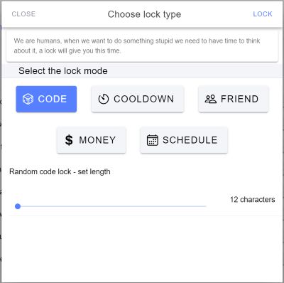 When you turn on the block, you have the option of locking it. This will require you to take further action before it unlocks. There are 5 options, which include typing in a code (you choose the length), a cooldown time, sending the code to a friend, sending money to DigitalZen or keeping it locked until a date and time.