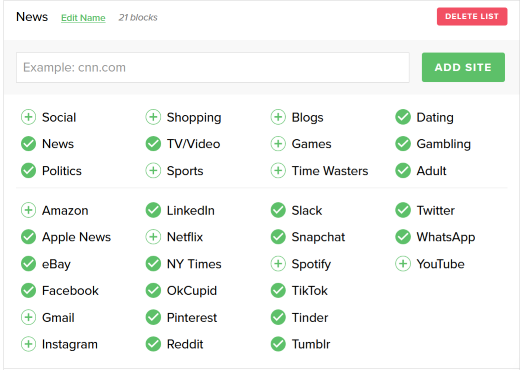 Freedom answered all of my wishes. It allowed me to block by category, set up blocking times, and not delete the app while it was running.