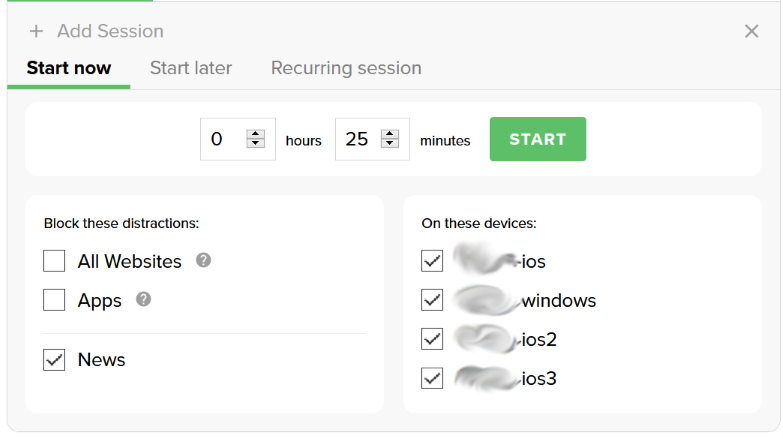 Next, I set it up a session for all of my devices. I set it to last 24 hours, selected my News block, and then added all my devices to it.