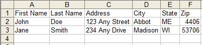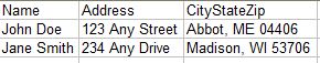 Let’s say we have a spreadsheet with 6 columns: First Name, Last Name, Address, City, State and ZIP. We want to transform those into three columns: Name, Address, CityStateZIP. Here is what the data would look like to start with: