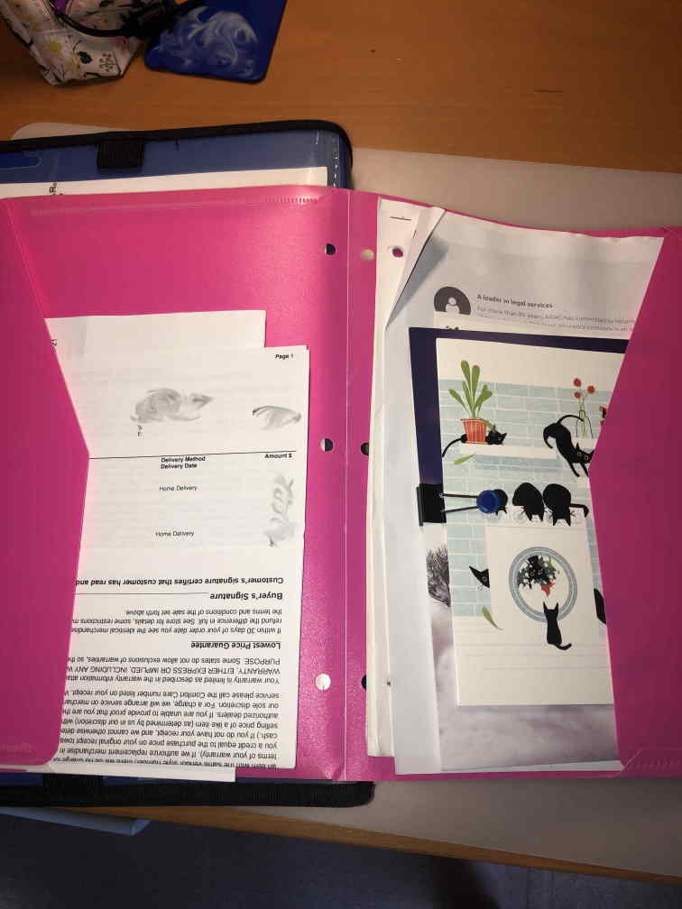 I pulled a portfolio folder and put the papers inside. My task list entry was “Renew cat license” which I made due the next week and tagged with both #PF and #oneoff. This combination indicated to me that the papers were in the folder, which was then put in the second tray of the document box.