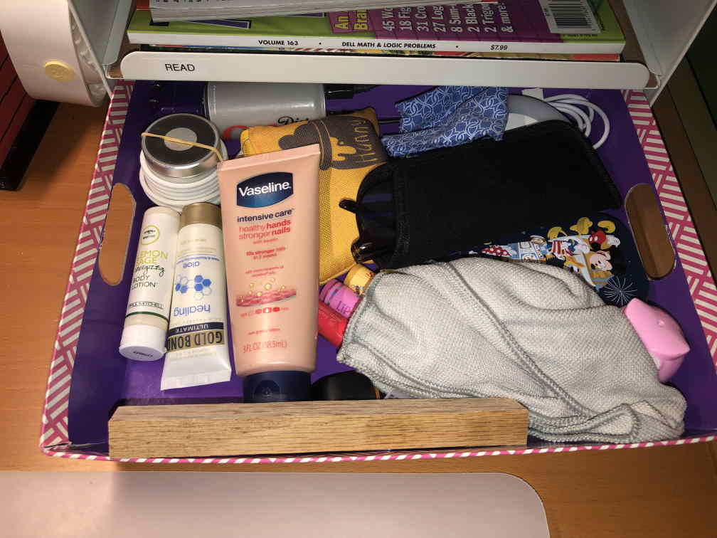 And the bottom was the supplies basket. (Since I don’t have drawers in my desk, this is the repository for things like lotion, cords and lip balm)