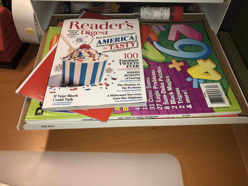 The fourth for periodicals. I chose to keep periodicals here simply because it is more in my sight than other places in the house. I have tried keeping them next to chairs I commonly use, next to my bed, and in my work bag. Keeping them on my desk means that when a new one comes in, I am able to see how many are waiting for me to read and either read it immediately or recycle it.