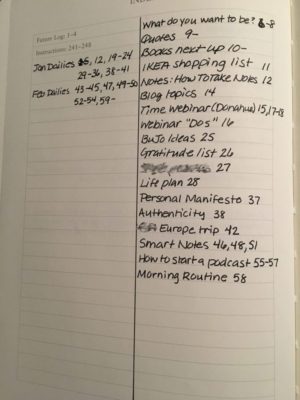 I did divide my table of contents pages in half vertically. I like to keep my daily entries separate from the note pages so that I don’t have to scan so much when I am looking for things. I do this in my work journal, and found it effective.
