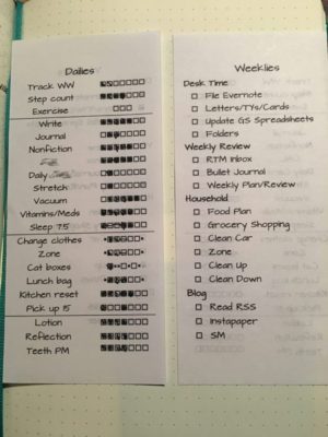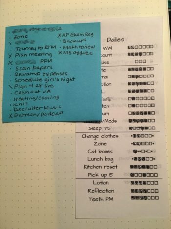 There are things I want to track that I don’t want to write down. These are the habit reminders and weekly maintenance tasks. Instead, I made a small form with boxes to color in when I did things; I hold this to the page opposite my current daily page with a sticky note.