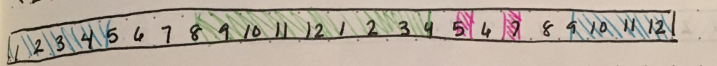 I experimented with a vertical time bar, but this didn’t work well for me. It was too clunky as I tried to write things in next to it. Instead, I settled on a horizontal time bar. This is a simple listing of the hours, and then I shade in the areas that are already spoken for. This is the only place I use color in my journal.