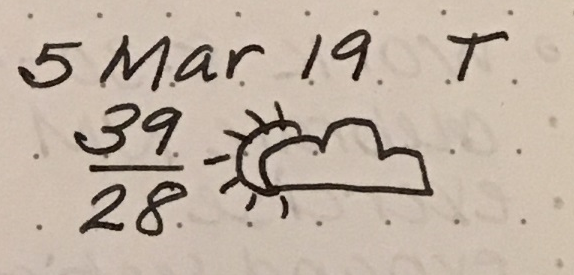 I look at the weather each night and add a quick high/low temperature to the daily spread right under the date. I started adding a quick symbol to indicate what type of weather we had. This reminds me to grab an umbrella or sunglasses on the way out the door.