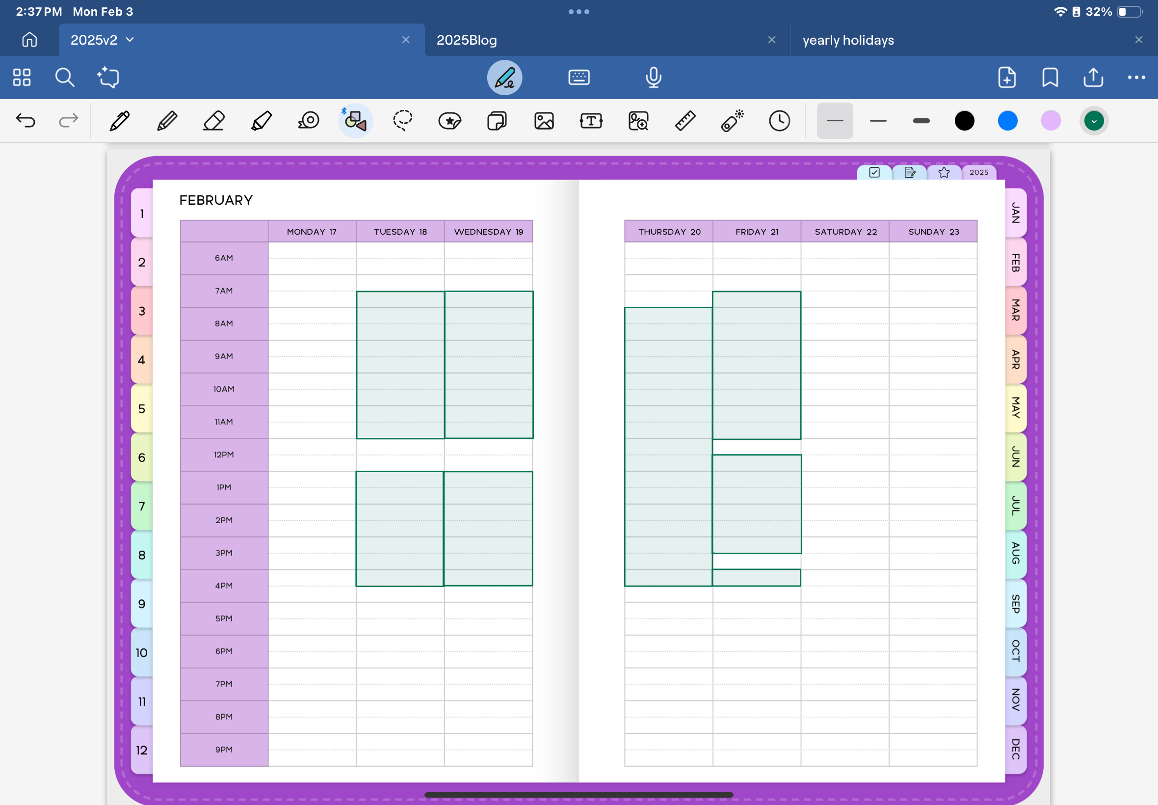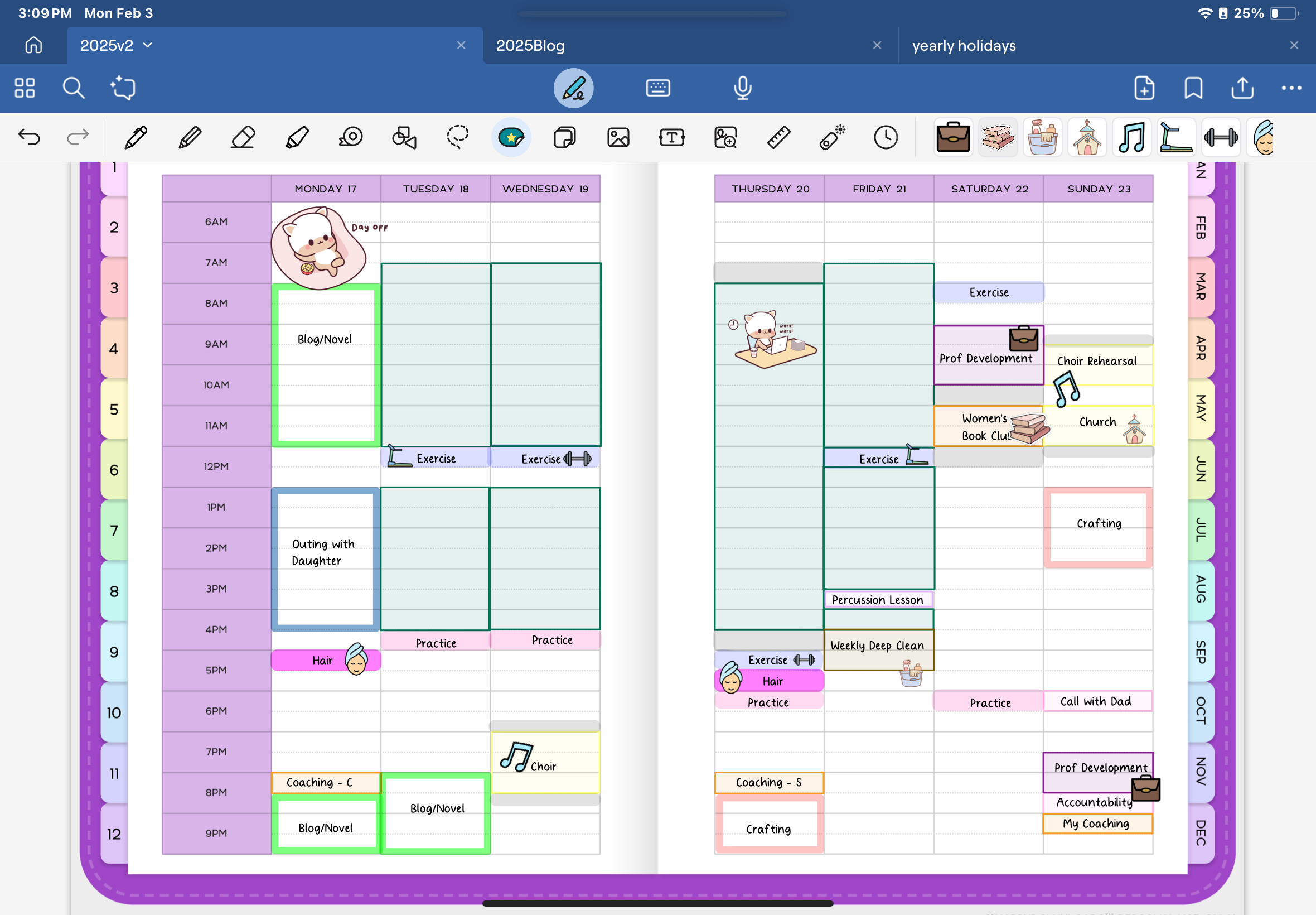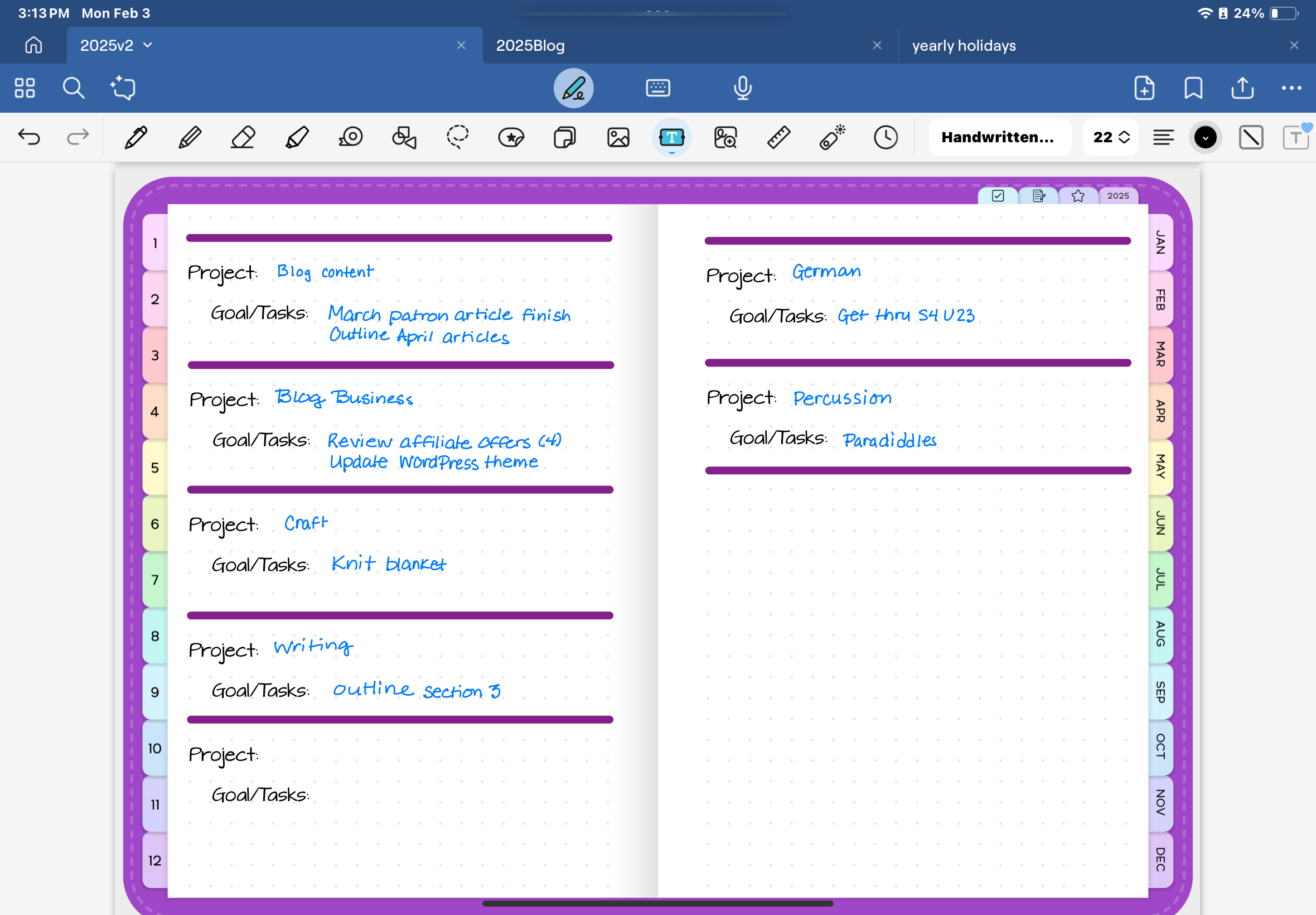My planning notebook is a minimalist layout (meaning no extra tracking pages) with a purple (custom) color, white pages, for 2025 with a Monday start, rainbow 1-12 tabs, weekly pages (layout 5 of 12), no daily pages (of 8 options), and no links to Apple or Google calendars.