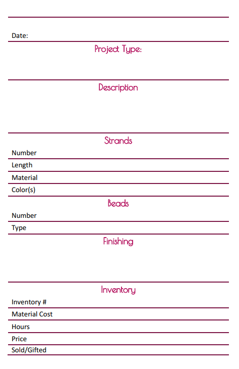 - Material cost, hours to make, inventory number, and sold or gifted.