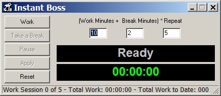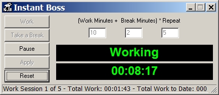 What it does. The application starts up with a straight-forward interface. You set the working time, the break time and the number of repeats, then press Work.