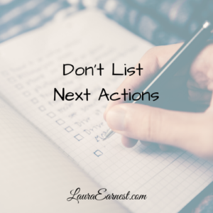 It is really easy to get bogged down in the minutiae. We can start thinking of all the steps that need to be done to get a specific result, and lose sight of the end game: the result itself.I find that instead of writing down the next actions, it is better to write down what I am trying to accomplish.