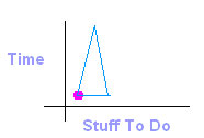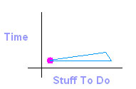 Visualize this on a graph. The y-axis is (negative) time, or the time closest to the pinned point is the furthest away in true time; and x-axis is the amount that can be done. If time is very far away from today (low on the y-axis), the amount that can be accomplished is greater (Fig. 1). If you move time far up the y-axis, or require something to be done sooner, the amount that can be done must be reduced. (Fig. 2)